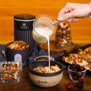 A Pausei é uma granola de nuts, zero açúcar, zero glúten, zero maltitol, sem grãos e low carb.